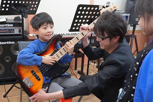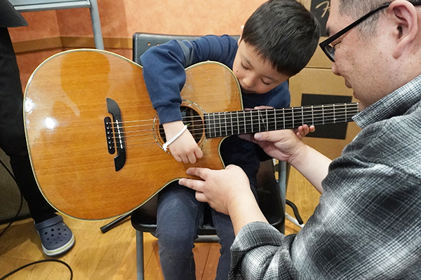 今回参加したほとんどのお子さまが、ギターに触れるのが初めてとのことで、弦を巻きつける「ペグ」やエフェクターに付いているボリュームのつまみに興味を持つ子など、思い思いに楽しんでいる様子でした。