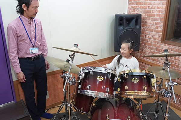 ホールのステージ上では、「ギター体験」「ドラムセット大解剖」「パーカッション体験」を実施。ギャラリースペースでは「何でも太鼓でリズム遊び」「手づくりマラカスでセッション」など参加者と一緒に音楽を体験。