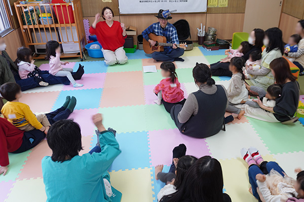 普段身の回りにある物を「太鼓」にしてリズム遊びをしながら、ギターの生演奏に合わせてみんなでうたを歌う内容で、昨年に続き2回目の開催です。